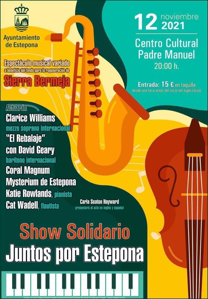 El 12 de noviembre, la Coral participó en el Show Solidario, Juntos por Estepona, evento que contó con cinco actuaciones musicales distintas. El “Show Solidario” buscó recaudar fondos para nuestra Sierra Bermeja a consecuencia del devastador incendio del pasado mes de septiembre que afectó a más de 8.401 hectáreas. Todos los músicos y cantantes aportaron sus voces y talento para apoyar la cuestación destinada a la restauración del territorio quemado en la Sierra de nuestro municipio de Estepona. Nuestra participación en este evento solidario ha sido muy aplaudida, sirviendo del cierre del “Show”.