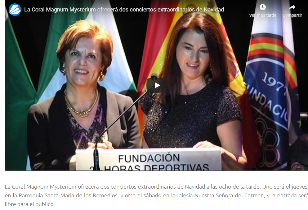 El pasado 19 de Diciembre de 2020, la Coral Magnum Mysterium ha salido a la calle, y ha recorrido parte del centro, interpretando las tradicionales canciones "Adeste Fideles" y "Noche de Paz". Lo hemos hecho en lugar de la celebración del Concierto de Navidad, que tuvo que suspenderse.