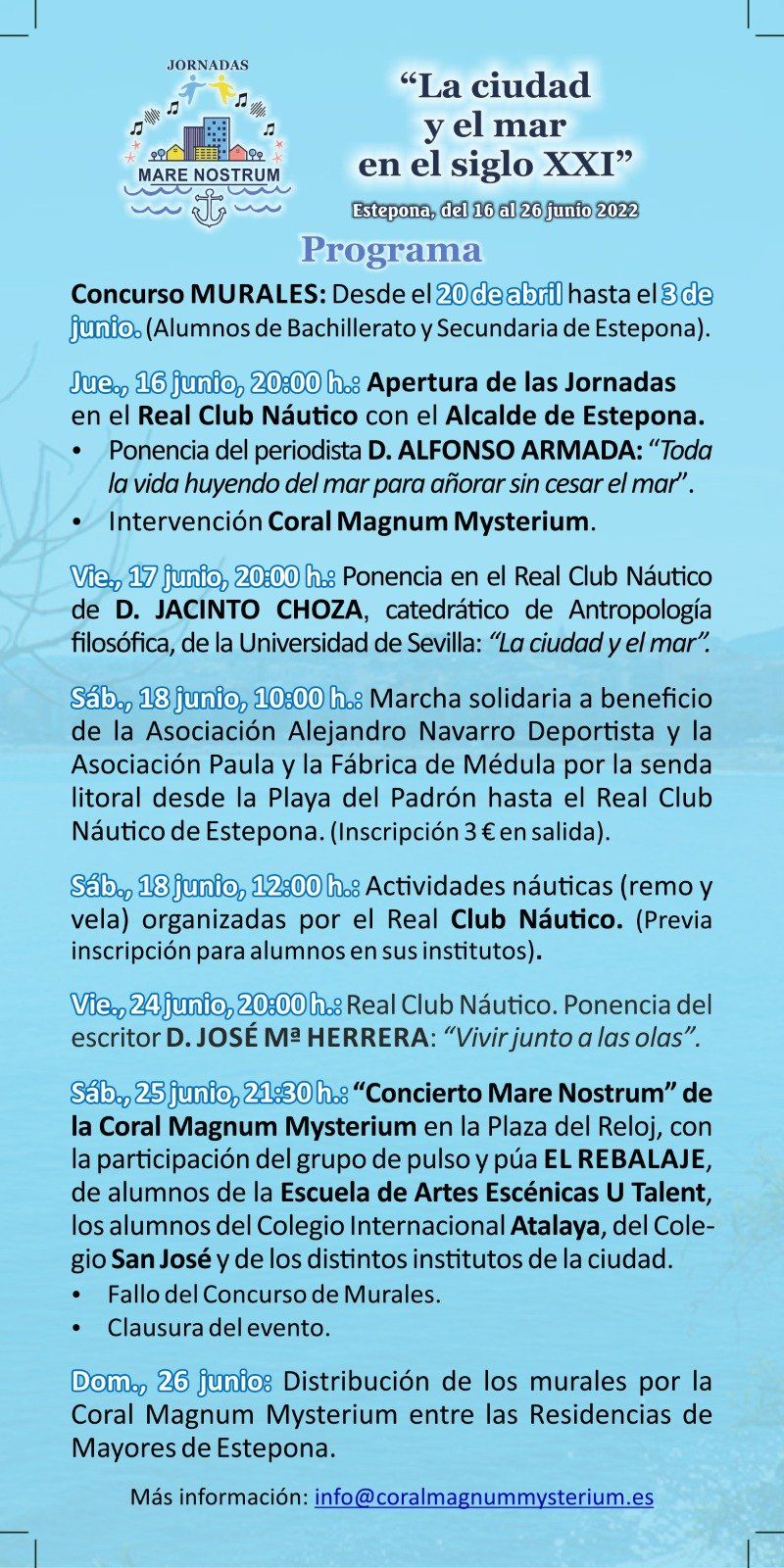 "...Para esta nueva edición, que se desarrollará del 13 al 15 de marzo, se han programado más de una veintena de actividades. De entre ellas, Begoña Ortíz, ha anunciado que como novedad este año nuestra localidad acogerá por primera vez el I Estepona Internacional Choir Festival que contará con la participación de la Coral Iberoamericana Tantanakuy de Málaga, la Asociación Coral ‘Andrés del Río Abaurrea’ de Ceuta, la Coral ‘San Juan Bautista’ de Coín, Chorale Al Boughaz de Tánger y Coro Joven del Conservatorio ‘Gonzalo Martín Tenllado’ de Málaga, así como la Coral Magnum Mysterium y los coros de los colegios San José y Atalaya de Estepona. Se celebrará el sábado, 14 de marzo, a las 19.00 horas, en la plaza del Reloj..."